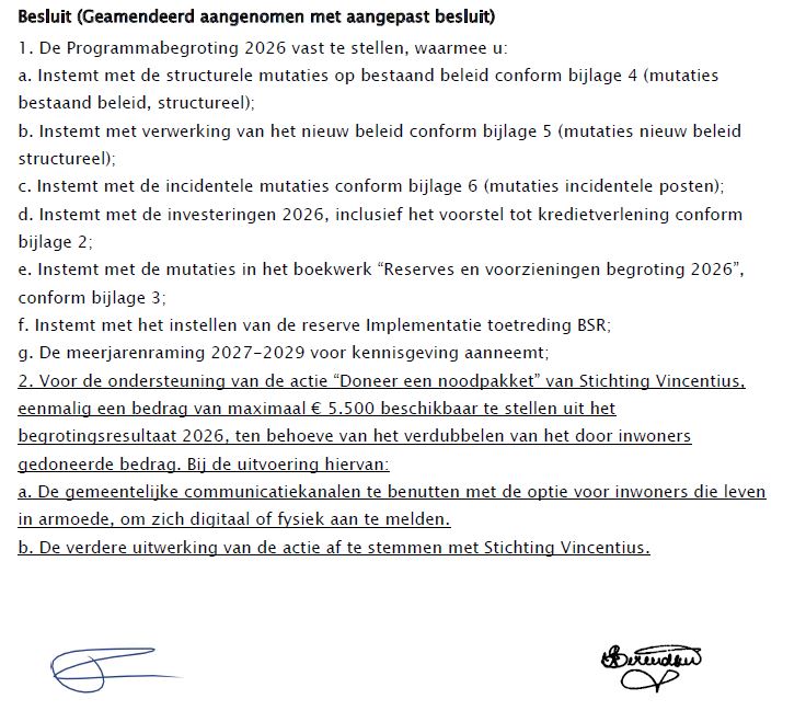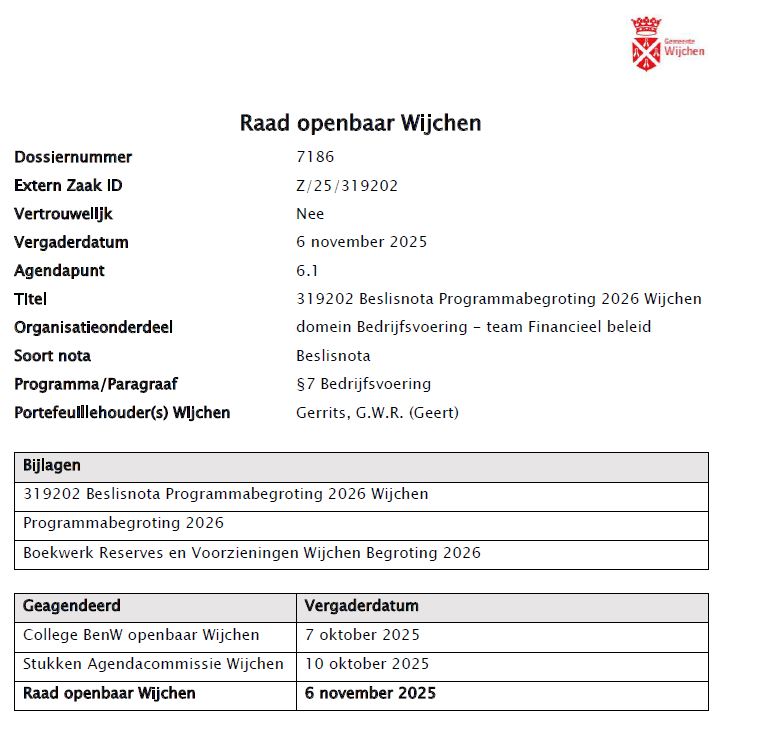 De gemeenteraad van Wijchen heeft op 6 november de Programmabegroting 2026 vastgesteld: